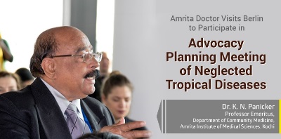 Dr.K.N.Panicker, Prof.Emeritus, Community Medicine AIMS and Chair of Indian Network for Neglected Tropical Diseases visited Addis Ababa, Ethiopia from 24th to 26th, September 2018 on an invitation from NTD NGDO Network to participate in their NNN 9 Conference. He was a Guest Speaker in the Global Forum for Filariasis, Leprosy and other NTDs. The major theme of discussion in this forum was morbidity management, disability prevention and rehabilitation of patients with either of these diseases. In this context, the Indian experience of the AMRITA - iNTD was of major attraction during the discussions in the forum. As an Amrita iNTD initiative a rehabilitation programme of disabled Lymphoedema patients was already been in force in Cherthala, Kerala, India which is the well-known endemic pocket for Brugian filariasis for centuries. The core activity is to provide micro finance to filarial patients to start some income generating activity. There are hundreds of such diseased individuals leading a miserable life when they are abandoned by their kith and kin. In order to make them independent they were introduced into varied small scale income generating activity. Patients were provided with some seed money for initiating poultry, goat rearing, .cattle rearing, tailoring and small scale vending. The profit is to be shared among patients for new ventures. The uniqueness of the program is that the financial support for the entire activity came from a local corporate K Chittilappilly Foundation. This Private partnership is a strategy advocated by organisations such as WHO and GAELF. This Rehabilitation Project attracted the attention of all gathered in the Global Forum especially the committed international donor agencies. Thus Amrita /iNTD experience turned out to be a role model for rehabilitation of disabled filarial patients at the Global level.